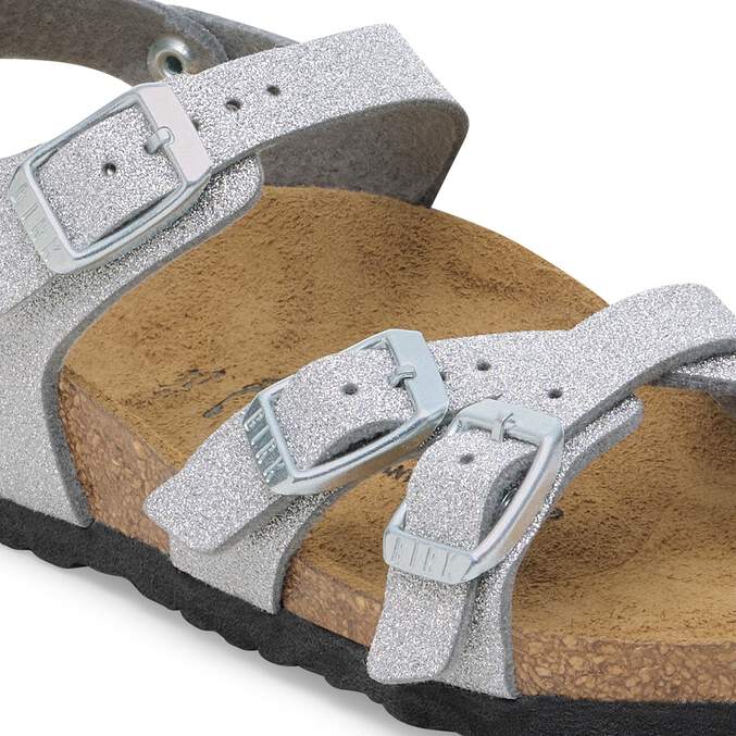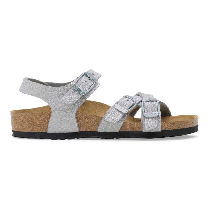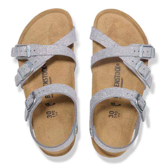 The BIRKENSTOCK Kumba is a pretty sandal featuring crossover straps and an ankle strap for a secure and comfortable grip. It’s just the thing for hot summer days. This version is made from a synthetic material with a TPU coating that uses special nanotechnology to create a shiny glitter effect. This technology ensures that no glitter dust falls off.