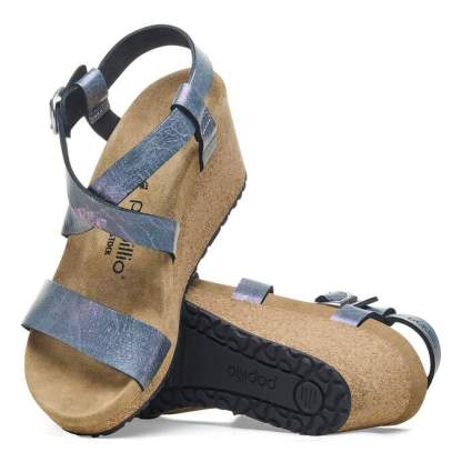 From Papillio® by BIRKENSTOCK®. The Sibyl wedge levels up with comfort and ease, catching eyes as it goes. Metallic leather straps crisscross comfortably across the foot, brought together by a shiny, rounded buckle. Lifted by a classic cork wedge, built around the contoured footbed you love.