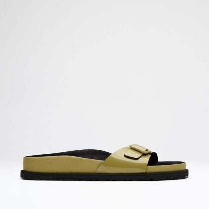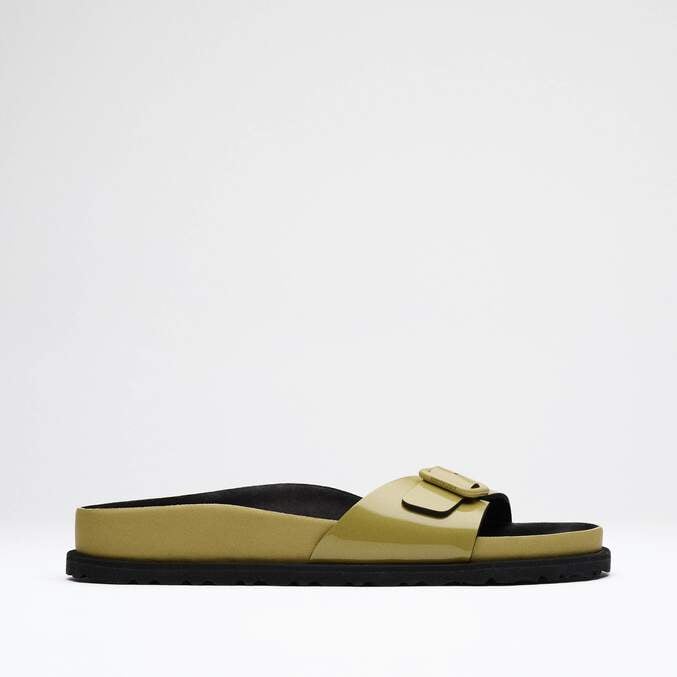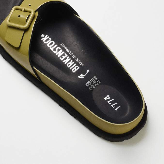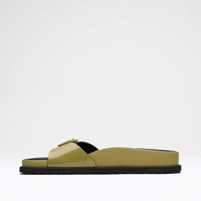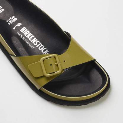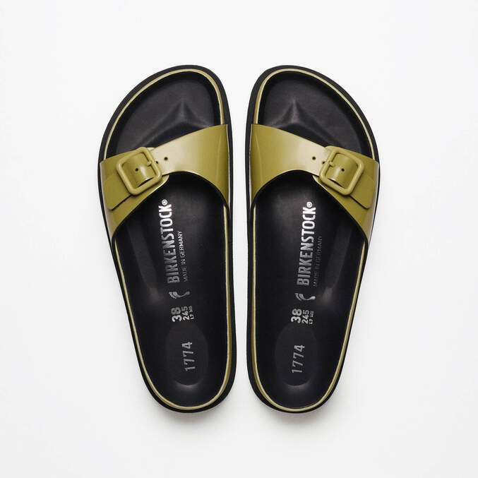 A new interpretation of our iconic Madrid silhouette appears in this new 1774 Collection with luxurious smooth patent leather and a shiny finish. This redesigned Madrid celebrates the essence of the BIRKENSTOCK design with high-quality materials and unparalleled craftsmanship. The footbed, covered with premium black leather, creates a unmistakable feeling of luxury. With its fine details and the color-coordinated, minimalist buckle, the sandal appears refined and elegant.