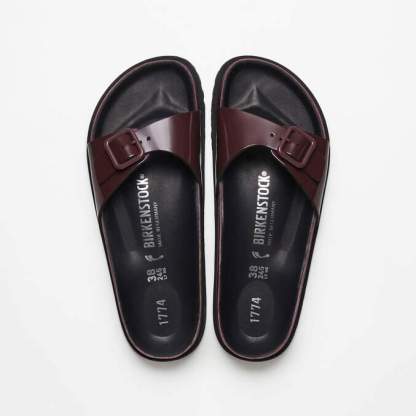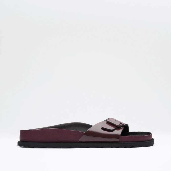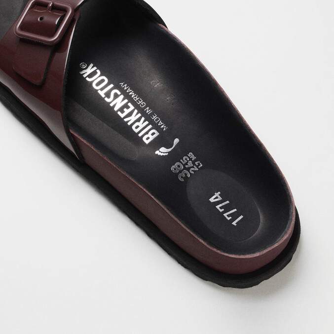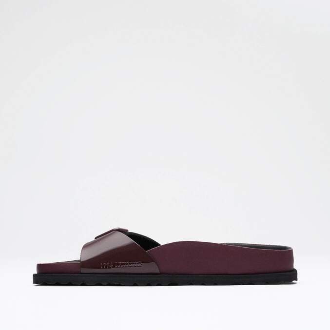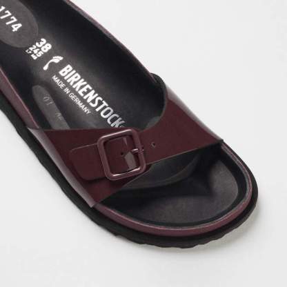 A new interpretation of our iconic Madrid silhouette appears in this new 1774 Collection with luxurious smooth patent leather and a shiny finish. This redesigned Madrid celebrates the essence of the BIRKENSTOCK design with high-quality materials and unparalleled craftsmanship. The footbed, covered with premium black leather, creates a unmistakable feeling of luxury. With its fine details and the color-coordinated, minimalist buckle, the sandal appears refined and elegant.