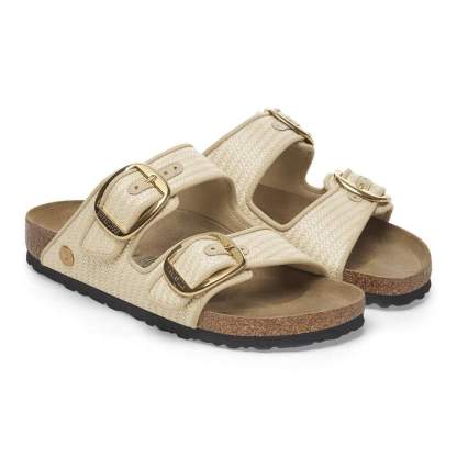 Raffia style, extra polish. The Arizona sandal reframes the woven look with tonal piping and oversized, gleaming buckles. All on a contoured footbed that actually supports your style.