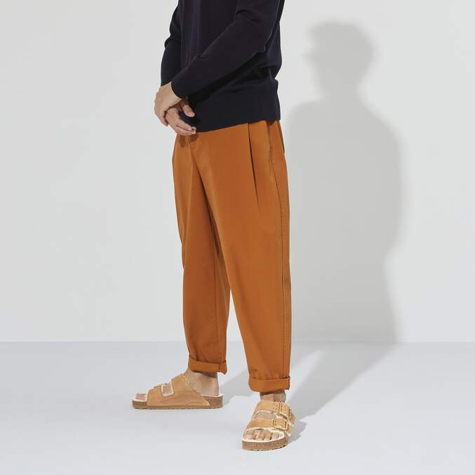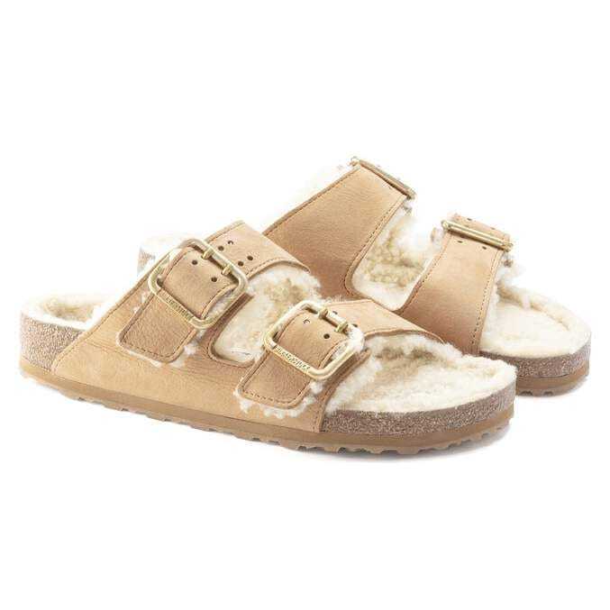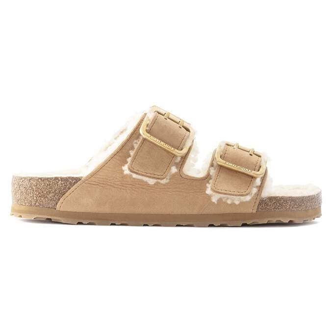 The legendary two-strap design from BIRKENSTOCK - the Arizona. This modern version features a shearling lining and is complemented by brass buckles. This style featues a grip sole, a cushioning midsole made from EVA and an outsole made from genuine rubber. The upper is made from high-quality, soft nubuck leather.