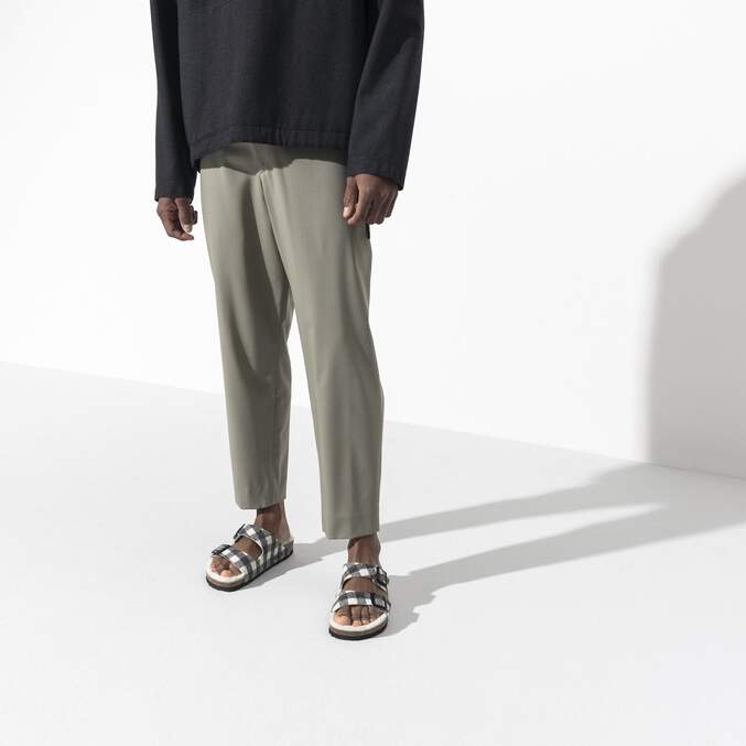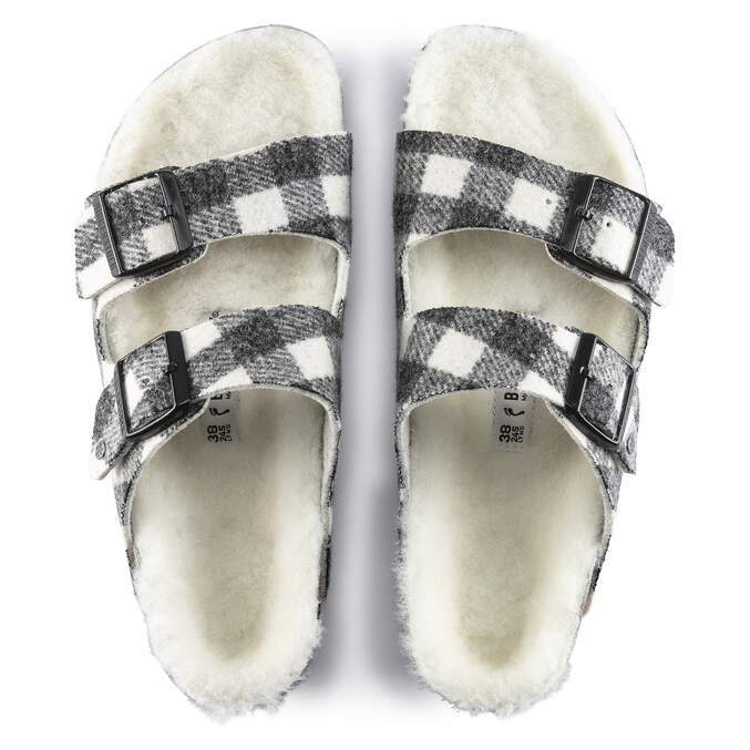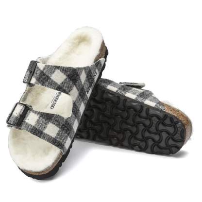 The popular BIRKENSTOCK Arizona is a classic model with two adjustable straps. Featured in a cozy wool plaid with bright genuine shearling lining on the anatomically formed cork-latex footbed. These sandals are perfect for chilly, winter evenings.The upper is made from soft wool.