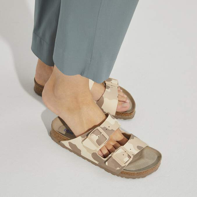 The legendary two-strap design from BIRKENSTOCK - the Arizona. Iconic style complemented with the signature comfort of the BIRKENSTOCK footbed. Featuring a muted camouflage print, as well as tonal buckles. With its additional foam layer, the soft footbed offers extra comfort – all day long. The upper is made from Birko-Flor®.