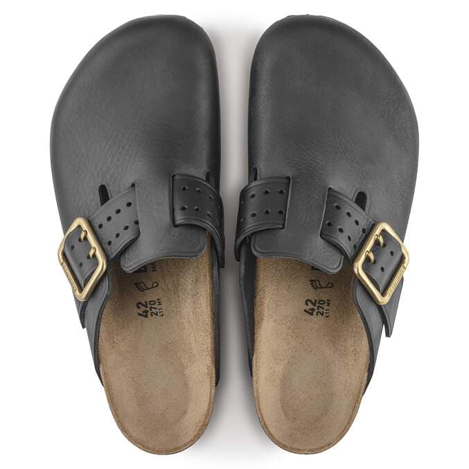 The signature slip-on clog from BIRKENSTOCK - the Boston. A casual-wear staple that is perfect all year round with a simple, adjustable design and contoured cork footbed that forms to the shape of your foot. This modern version of our iconic Boston clog features a double prong brass tonal buckle and a high traction rubber outsole. The cushioning midsole made from EVA promotes stability and comfort. Made of premium leather with edge embossing