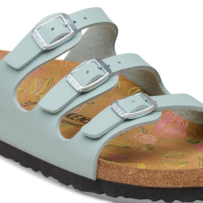 The BIRKENSTOCK Florida is the ideal sandal for anyone who spends a lot of time on their feet. This three-strap sandal offers good support and maximum comfort. This model features a feminine floral print on the footbed. The upper is made from the skin-friendly, hard-wearing synthetic material Birko-Flor® in a sophisticated nubuck look which boasts a texture and color that could almost be mistaken for real leather.
