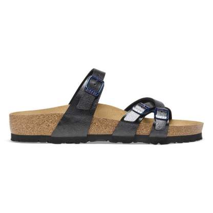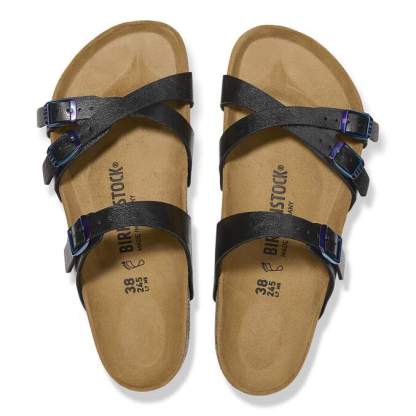 The BIRKENSTOCK Franca is a jaunty sandal with slim cross-over straps. The impressive combination of design and wearability will see fashion-conscious women through the day with elegance and comfort. Here, we see the sandal with a silky sheen finish. The color-coordinated details round off the shoe’s look of sophistication. The upper is made from the skin-friendly, hard-wearing synthetic material Birko-Flor®.