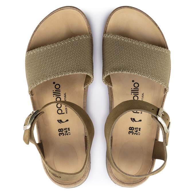 Introducing the Glenda from Papillio. A trendy, new back-strap flatform sandal. The mixed material straps round out the look - athletic inspired canvas and soft suede. Featuring the signature comfort you've come to know, with a lift. Take your BIRKENSTOCKs to the next level.