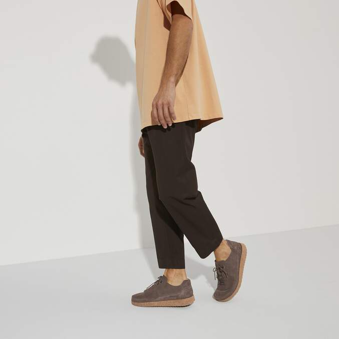 Introducing the BIRKENSTOCK Honnef - our newest street smart shoe engineered completely around our new Deep Blue Footbed. The four part footbed includes a moisture wicking microfiber liner, cork and jute layers for optimum arch support and a PU base for added shock absorption and forefoot cushioning. The sporty lace up style is perfect for your most active days whether that’s all day around town or on your next travel adventure. The upper is made of perforated suede.