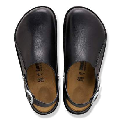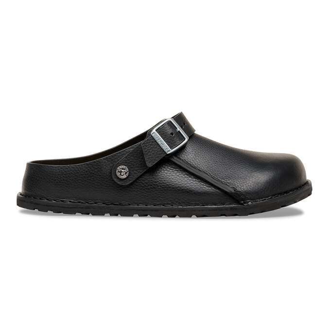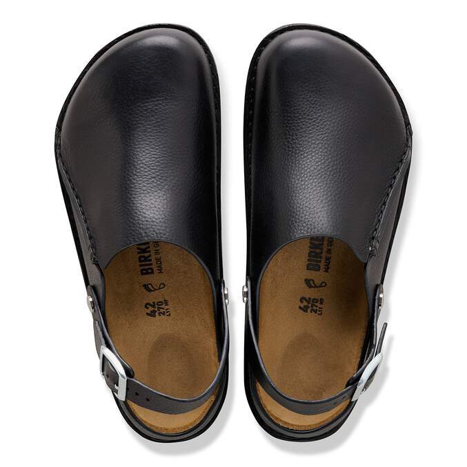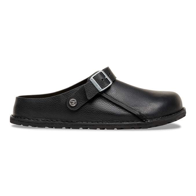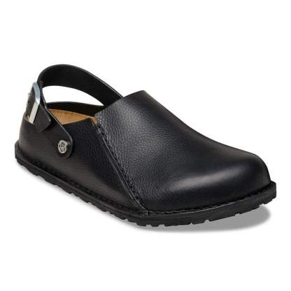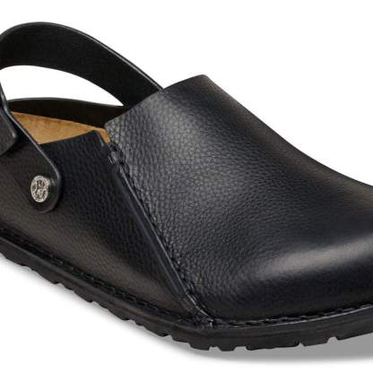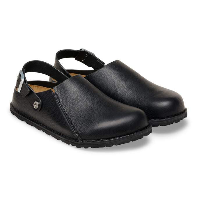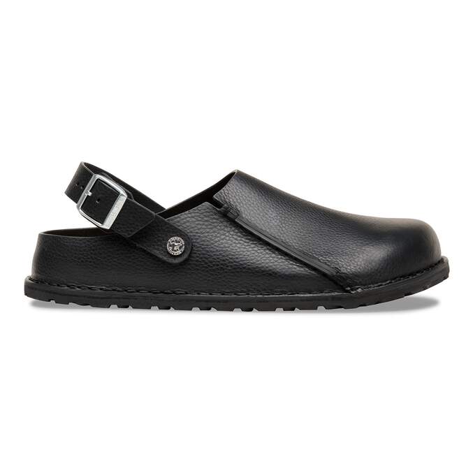 The BIRKENSTOCK Lutry is a slipper that can be worn as a backstrap style or as an open clog thanks to the flexible ankle strap. The footbed can be removed, for you to choose between three different footbed versions. This basic version features our standard footbed. It replicates the natural print made by a foot walking on sand and will see you through the day in comfort. The upper is made from soft, grained natural leather.
