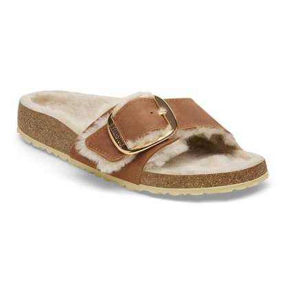 A strap, a buckle and a contoured cork footbed are masterfully combined to create the original Birkenstock sandal - the Madrid. This version is incredibly cozy featuring a color-coordinated genuine shearling lining, shearling lined straps and a big, elegant pin buckle. The upper is a soft yet durable oiled leather.