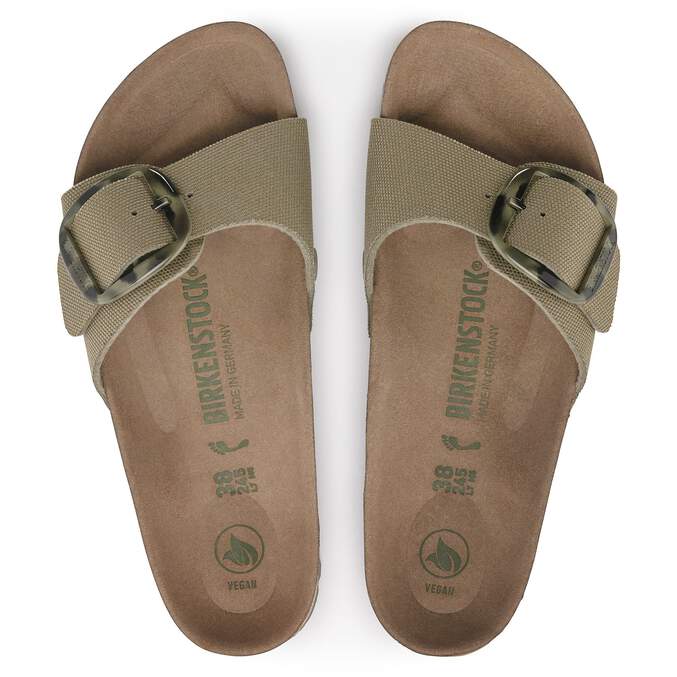 Effortlessly elegant. This season, the iconic Madrid sandal goes vegan with a 100% natural cotton canvas upper. A printed oversized buckle brings the style together with a statement finish. Complete with legendary BIRKENSTOCK design elements, like a contoured cork-latex footbed that shapes to you for custom support.