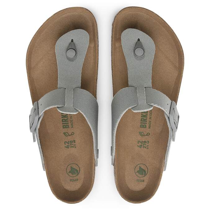 The BIRKENSTOCK Medina - a modern thong sandal. The bold straps and side buckle, combine for a fully adjustable fit on the instep. This classic model is now available in a vegan material, featuring a matte finish and a microfiber footbed liner. The upper is made of canvas textile.