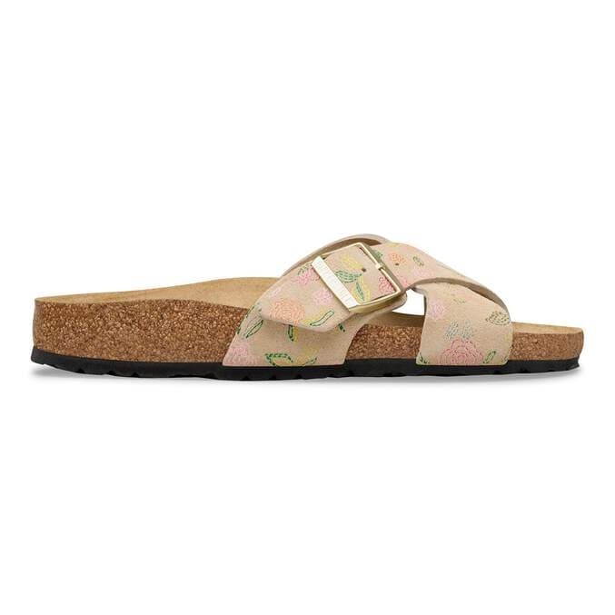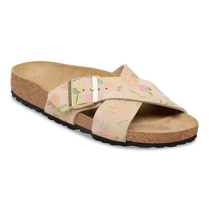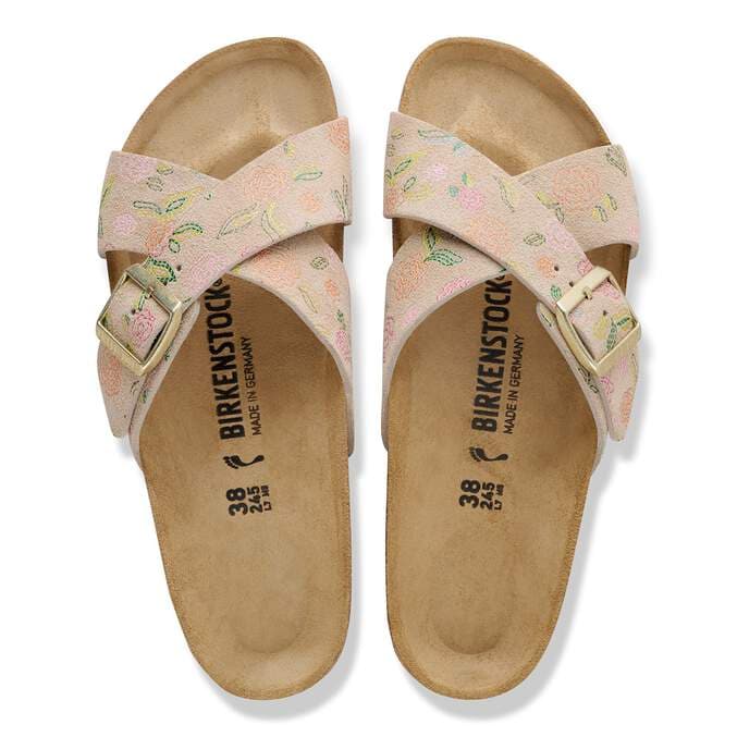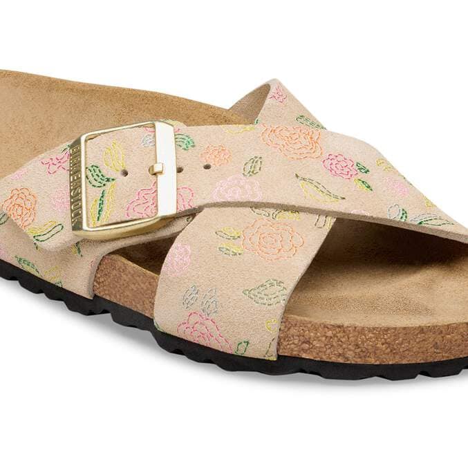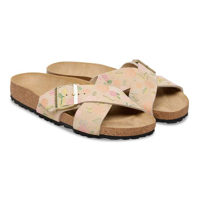 The BIRKENSTOCK Siena boasts a refined appearance. Crossover straps give the sandal its unique and special look. This version features a delicate, floral pattern. The upper is made from especially soft suede which hugs the foot like a second skin.